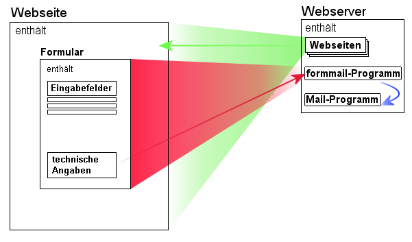 Du siehst, dass die Webseite (für die ja du selber zuständig bist) ein "Formular" enthalten muss. (Von daher kommt dann auch der Name "formmail"). Dieses Formular enthält die Eingabefelder, in die die Besucher etwas eintippen können, und einige technische Angaben, die du liefern musst, und die auf diesen paar Seiten erklärt werden.