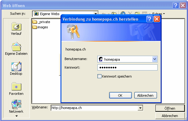 Danach versucht Frontpage, mit dem Webserver Verbindung herzustellen und fragt mich nach Benutzername und Kennwort. Diese habe ich vom Provider erhalten und kann sie jetzt eintippen. (Typisch Microsoft: es gibt ein Kästchen für "Kennwort speichern" - wenn ich das nun anklicke, werde ich künftig mein Kennwort nicht mehr eintippen müssen, bis ich es definitiv vergessen habe...)