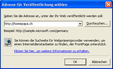 Frontpage fragt mich dann natürlich, wohin denn das Web soll. Schliesslich kennt es weder meinen Provider noch die von mir reservierte und aktivierte Adresse, woher denn auch?. Aber ich hab all diese Informationen. Die erste ist noch denkbar einfach: es handelt sich um den Namen meiner Website:
