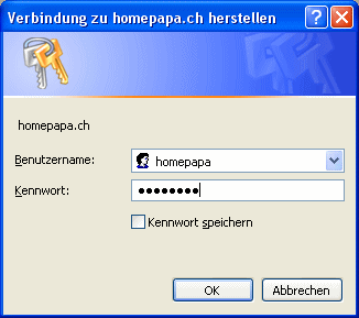Ich muss mich daher mit Benützeridentifikation und Passwort anmelden. Diese beiden Informationen hab ich vom Provider in seinem wichtigen Brief erhalten (vgl "Anmeldung bei Hosttown") und kann sie nun angeben.